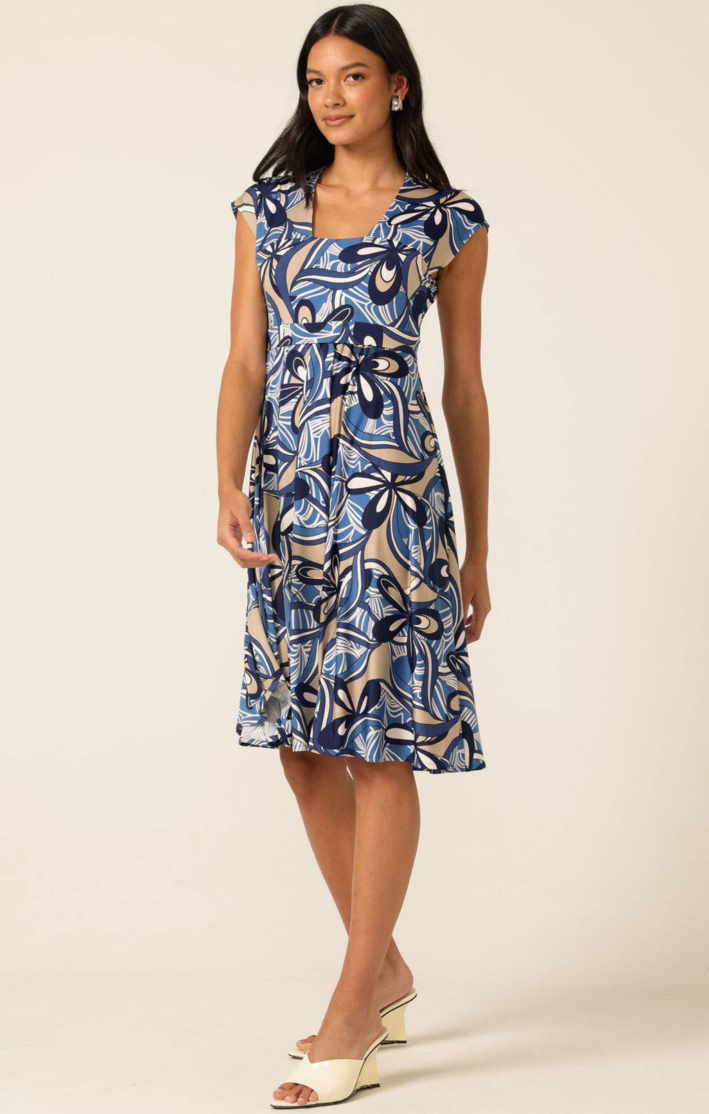 The Crystal Bay Dress is made from luxurious printed stretch jersey, featuring a flattering waistband detail that enhances the A-line fit and flare silhouette. With a narrow square neckline, slight cap sleeves, and knee-length cut, it’s the perfect throw-on-and-go style for weekends, holidays, and work.