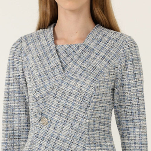 The Judith Jacket is made from a cotton blend blue stretch tweed with hints of pink, black, and white and features a double-breasted front with removeable shoulder pads. Finished with a silver button, this non-lined style can be worn open or closed, is perfect for layering, and can be worn for both work and events.