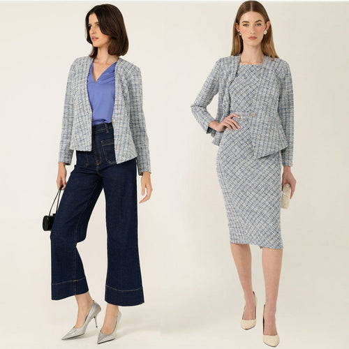 Made from a comfortable cotton‑poly stretch tweed in blue with hints of pink, black, and white, the Judith Jacket offers structure with ease — perfect for all‑day wear.