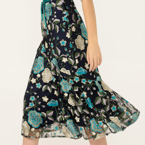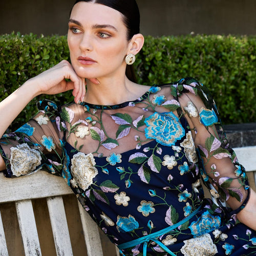 The Cardelina Dress is made from luxurious embroidered floral mesh with a soft satin lining, featuring soft ruched sleeves and an asymmetric flared godet hemline. Finished with an invisible back zip and a detachable teal ribbon belt with beaded ends, this midi-length dress is perfect for weddings and events.