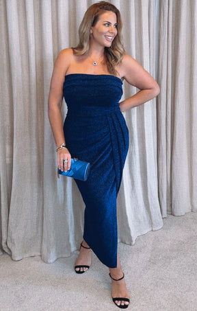 The Merle Strapless Maxi Dress is effortless elegance with a shimmering metallic stretch fabric and a flattering draped silhouette. Featuring a fold-down band detail, removable straps for bra-friendly styling, and a hidden elasticated waistband for shape, this maxi is perfect for formal events and weddings.