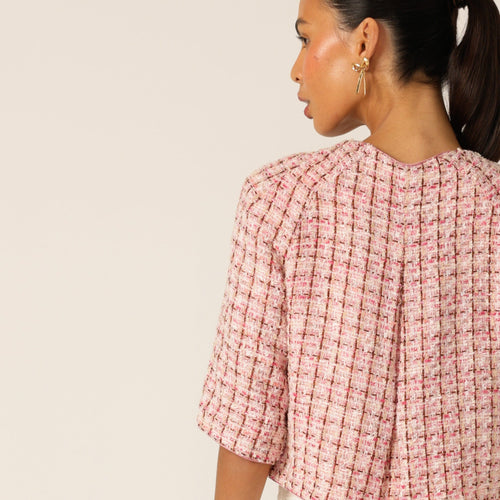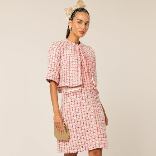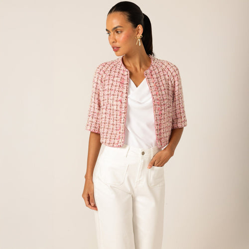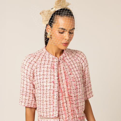 The La Rose Jacket is made from a pink tweed with lurex thread for a hint of shimmer, featuring fringe detailing, satin-bound edges, and a pleated back for ease of movement. Fully lined with an easy hook-and-bar closure, this cropped jacket is the perfect polished layer for work, events, and race days.