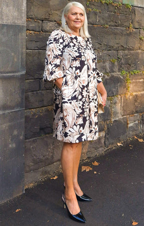 The Paisley Lane Shift Dress offers timeless elegance for work and events with its luxurious satin fabric and exclusive Italian print. Featuring a boat neckline, keyhole back, and a chic shift shape, this above-knee design is both stylish and relaxed.