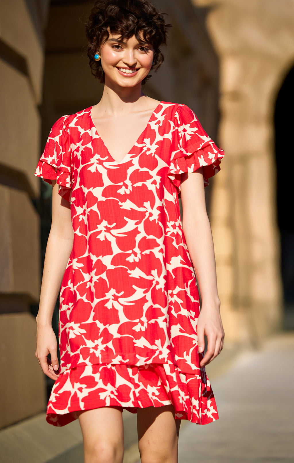 The Chilli Shift Dress is made from a lightweight viscose in a striking red floral print, designed with a relaxed loose-fit shape for comfort. Featuring a playful tiered frill hemline, fluted ruffle sleeves and pockets, and an easy pull-on style, this above-knee dress is perfect for everyday wear.