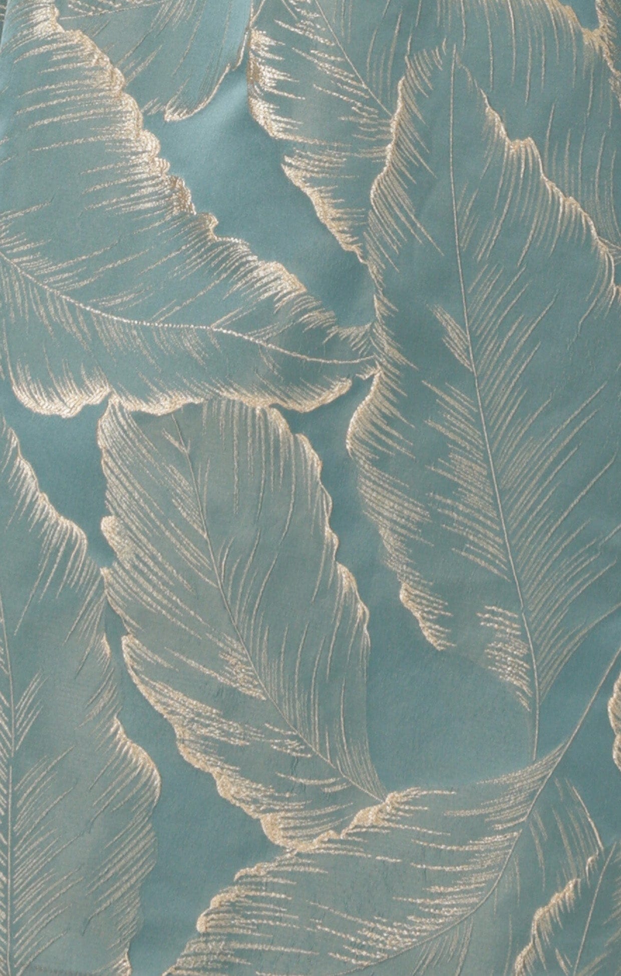 The Atelier Bolero and Gown Set pairs a luxurious duchess satin jacquard dress with a matching satin-lined bolero, featuring a golden thread leaf print and a convertible strap neckline. With its voluminous pleated A-line skirt, pockets, and maxi-length silhouette, this elegant two-piece is perfect for weddings and formal events.