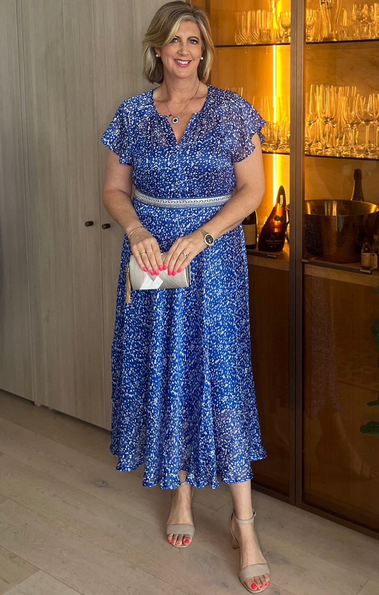 Elevate your style with the Renee Midi Dress, made from a lightweight chiffon with a fine metallic thread for a subtle shimmer. Featuring a round neckline, fluted sleeves, a flattering A-line midi silhouette, and a reversible embellished belt, this versatile piece will take you from work to events.