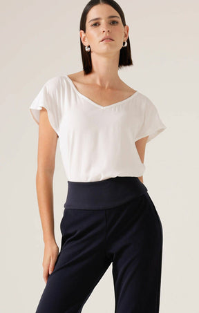 The Analia Top is a workwear essential, combining effortless style with lightweight comfort. Designed with a flattering V-neck, cap sleeves, and bust dart shaping, its versatile loose fit can be worn tucked in or out for a polished look.