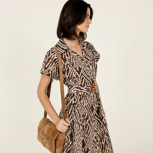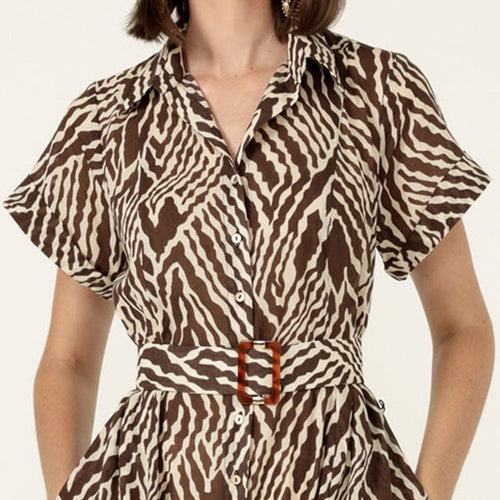 The Bonnie Dress is made from a lightweight linen rayon blend in a striking geometric print, featuring a functional button-down front and collared V-neckline. Complete with a removable-buckle self-tie belt and half slip, this versatile style is perfect for both work and weekend wear.