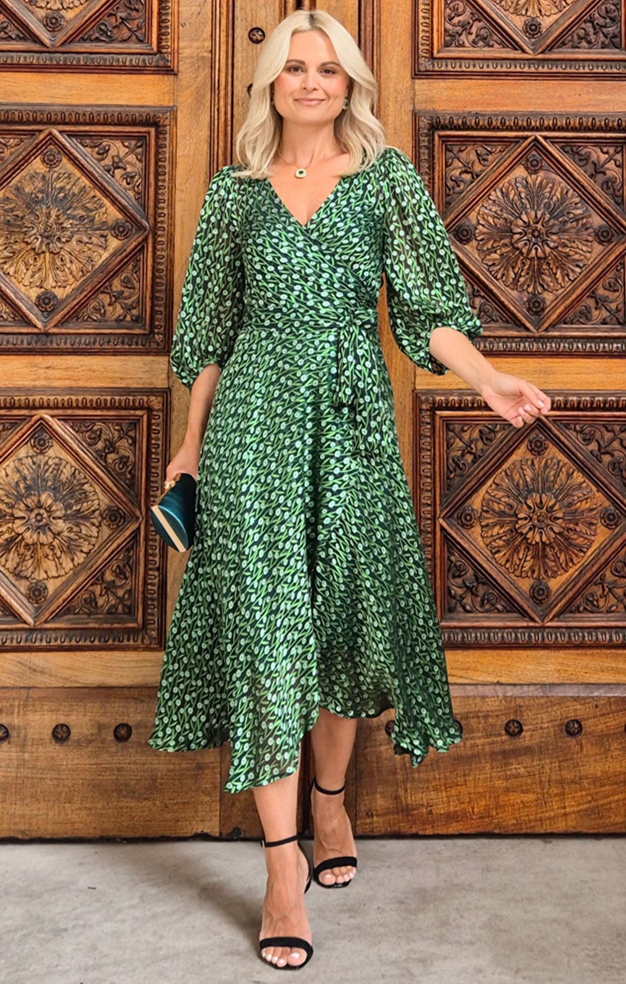 WONDERLAND MIDI WRAP DRESS IN EMERALD POPPY