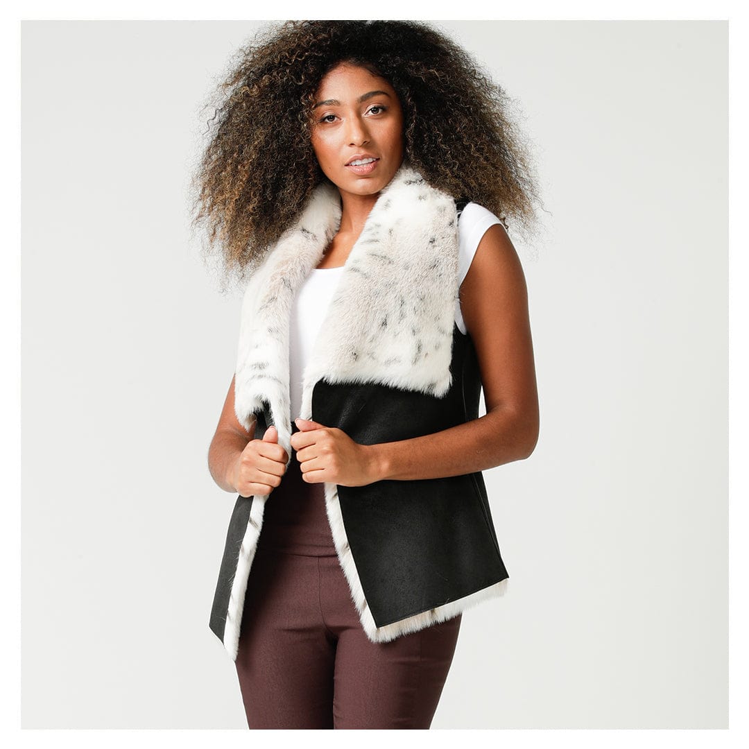 The new Faux Suede jacket and Faux fur vest are this seasons secret to injecting some lasting key trend styles into your wardrobe. The Faux fur vest is a great way to add instant warmth to dresses and 3/4 sleeve tops and is reversible for a fun fur finish or a sleek black faux leather look. Add a belt around the waist for a little extra detail and pizzazz. Match these back with the essential Skinny Pants and pull on bias skirt as photographed.