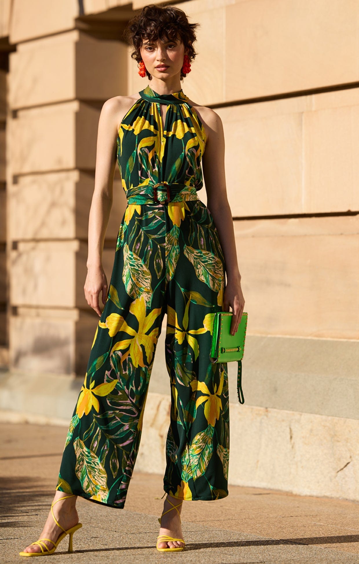 The Lemon Lagoon Jumpsuit is made from luxurious stretch jersey and showcases a vibrant exclusive SACHA DRAKE print with higher neckline and keyhole cut-out. Complete with a detachable self-tie belt, tortoise buckle for styling, and an ankle-length finish, this Australian-made piece is perfect for holidays, travel, and luncheons.