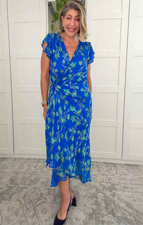 The Aphina Wrap Dress showcases our iconic wrap design in a luxurious silk rayon adorned with an exclusive metallic floral print. Lined through the body and featuring fluted cap sleeves with a hi-lo hemline, this statement piece is perfect for weddings, formal, and evening events.