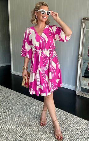 Made from lightweight viscose, the Flamingo Shift Dress features a relaxed A-line silhouette that can be worn loose or belted with the self-tie. Designed with bloused sleeves, side pockets, and an above-knee length, this versatile style is perfect for luncheons, races, and special events.