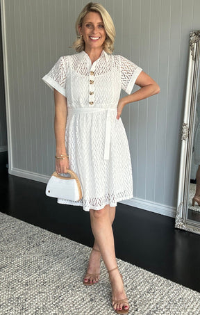 The White Lotus Shift Dress is made from a cotton blend lace outer and comes with a detached white jersey slip for comfort. Featuring a collared neckline with gold-toned faux buttons and a detachable tie belt, this versatile style can be worn loose or belted, making it versatile for holidays, day events, and luncheons.