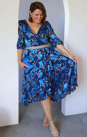 The Linnee Wrap Dress is made from a luxurious silk rayon blend and showcases SACHA DRAKE’s iconic wrap design in an exclusive print. Featuring bloused sleeves, a flattering A-line hi-lo silhouette, and a detachable sequin belt, this midi dress is perfect for weddings and special occasions.