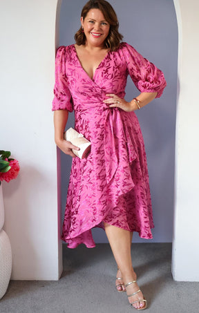 The Sherbet Breeze Midi Wrap Dress showcases our iconic wrap design, made in luxurious silk-rayon with an exclusive pink metallic floral print. With satin lining through the body and bloused sleeves with elasticated cuffs, this elegant dress is perfect for weddings, luncheons, and special events.