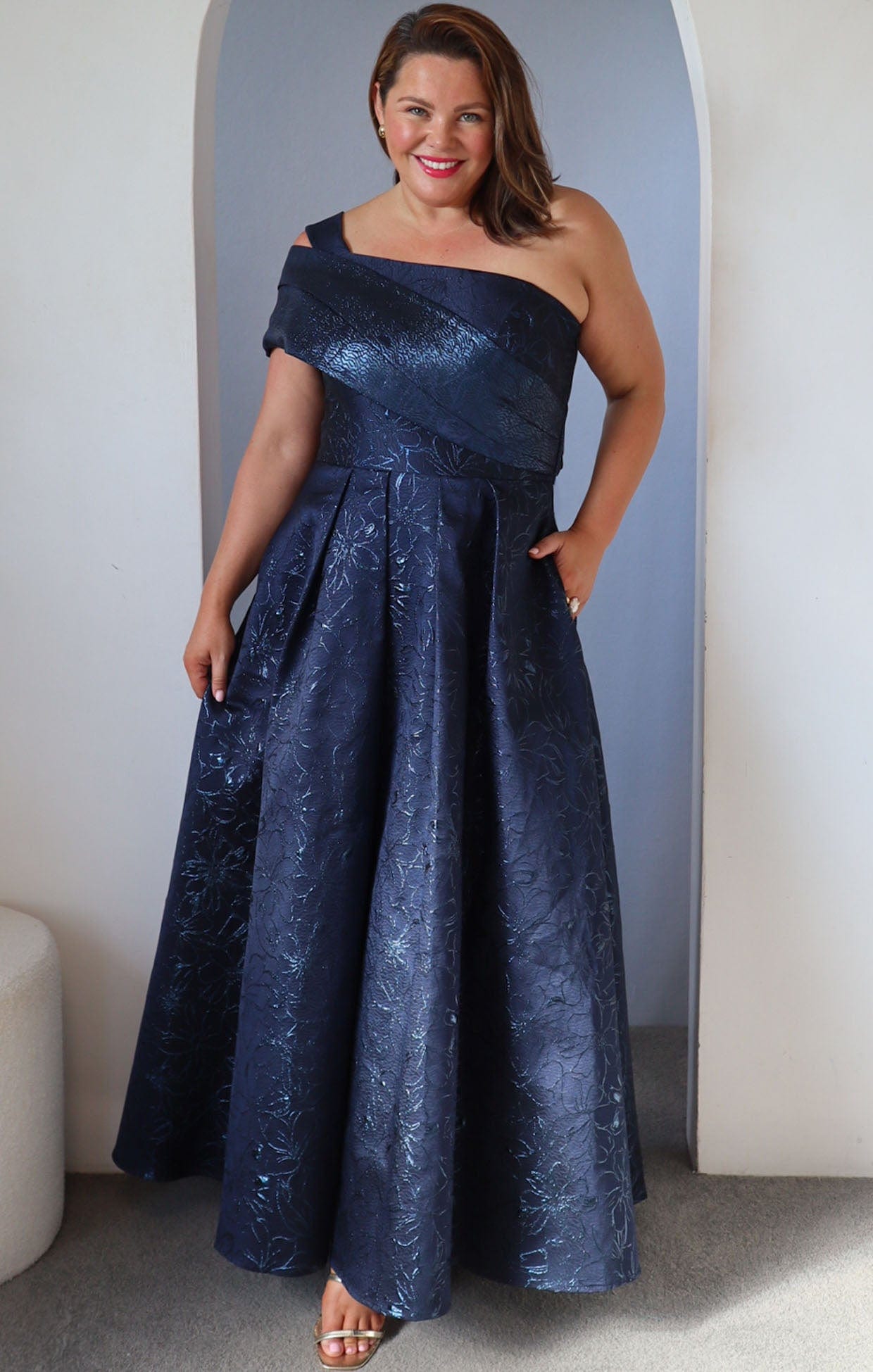 The Twilight Gown exudes opulence, perfect for weddings, events, and formal occasions. Crafted from metallic jacquard with a textured floral print, it features a one-shoulder design, a pleated A-line silhouette, functional side pockets, and a belt with a hook-and-eye clasp for a sleek finish.
