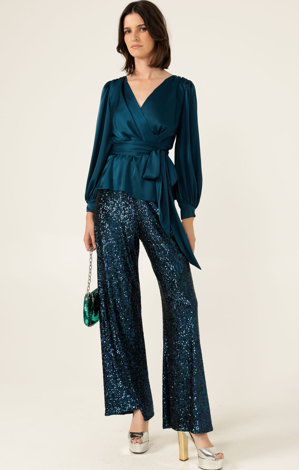 The Satin Faux Wrap Top is made from luxurious soft satin in a faux wrap silhouette, featuring a V-neckline, elasticated waist, and self-tie belt for a defined shape. Designed with longer bloused sleeves, a double-layered peplum, and back gathers for a flexible fit, this style is perfect for work & events.