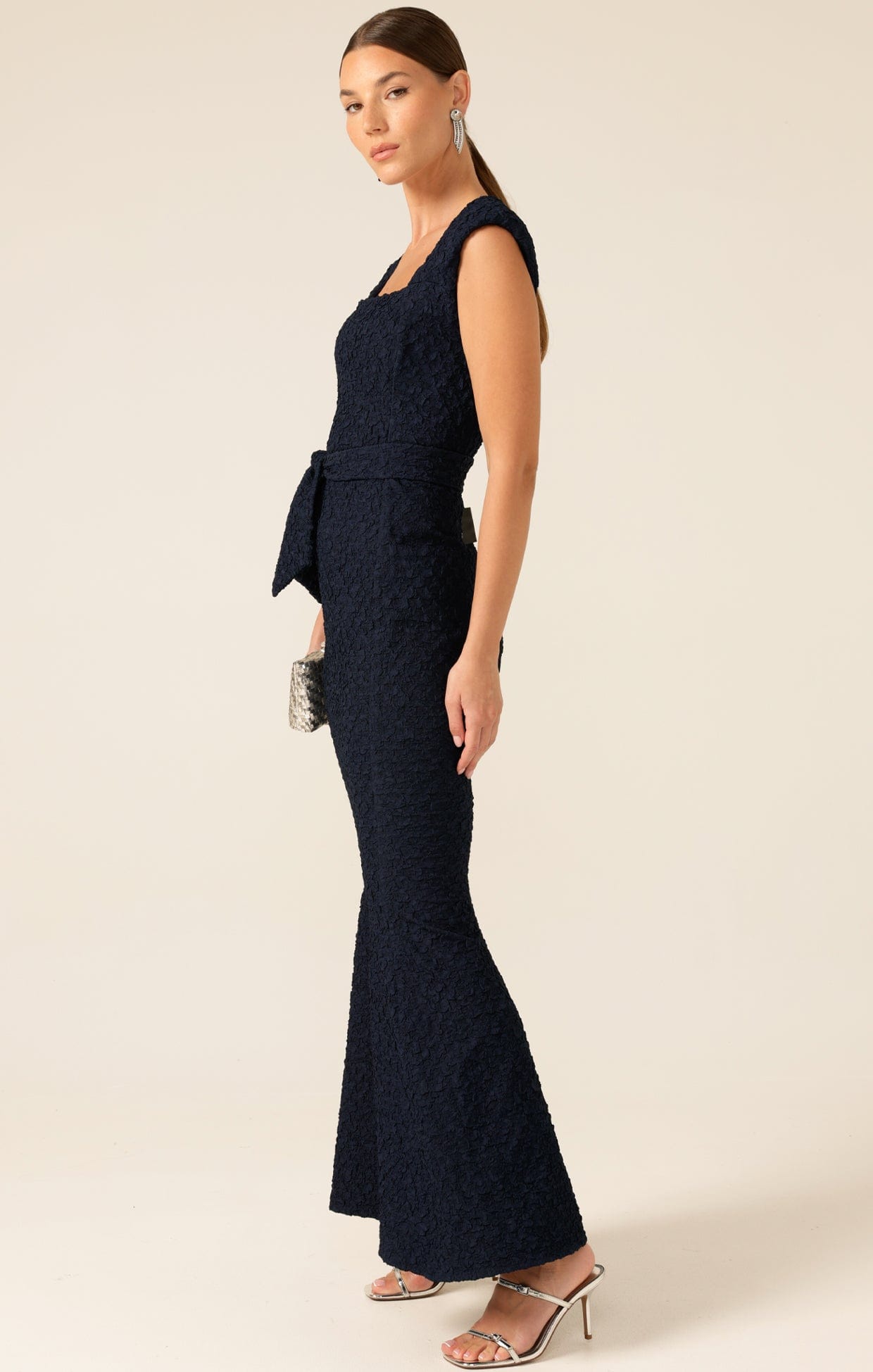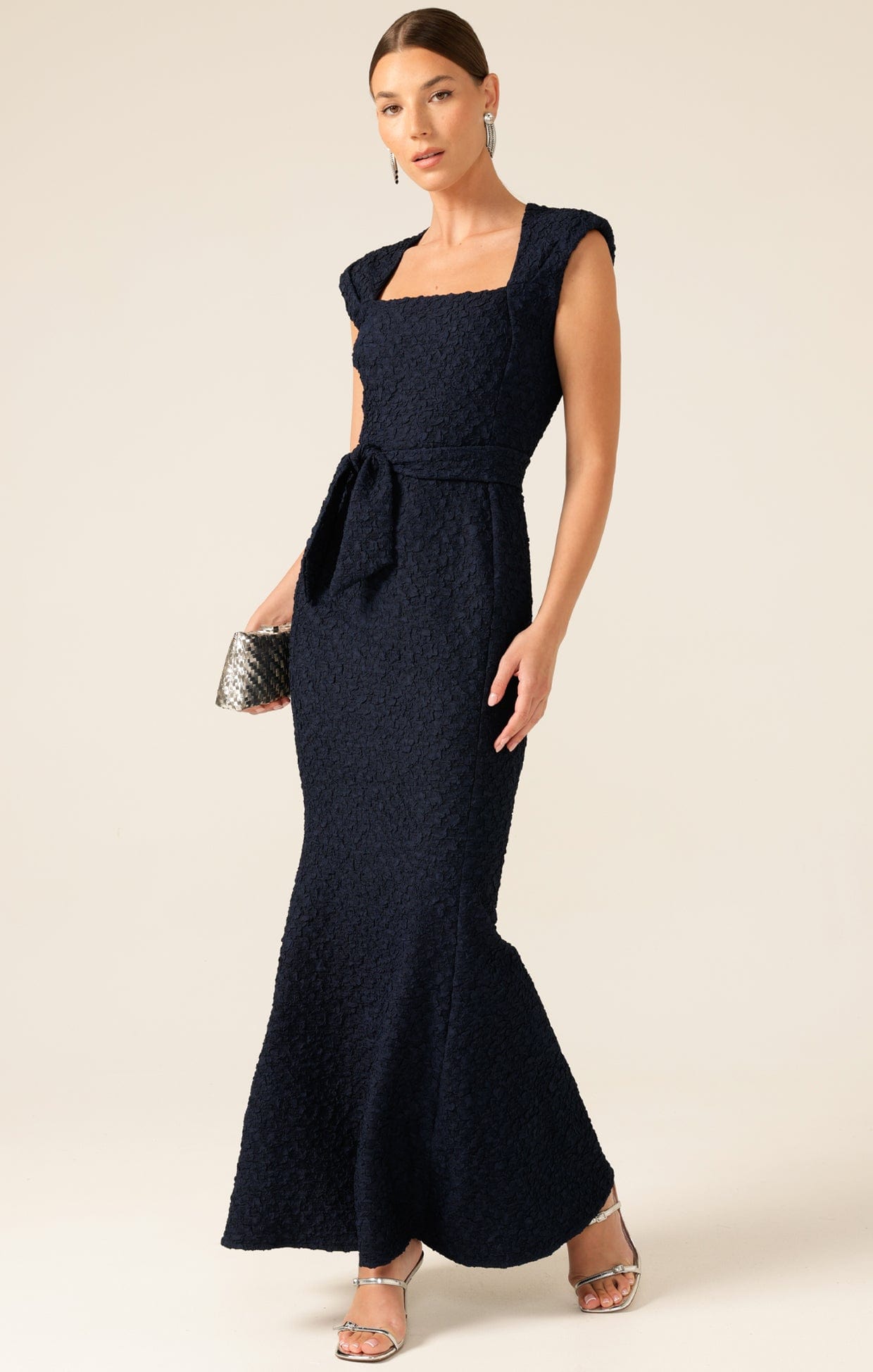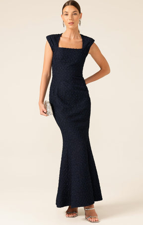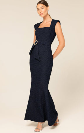The Gala Royale Gown in navy combines timeless elegance with luxury. Crafted from a premium crepe with a little ease, the slim-fit silhouette features a square neckline, cap sleeves, fishtail hemline and self tie belt. This Australian-made design is perfect for formal occasions, balls and weddings.
