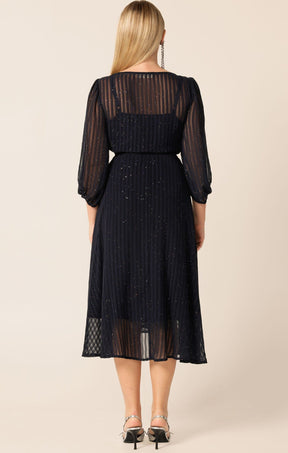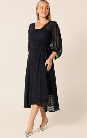 The Vivienne Dress is an iconic SACHA DRAKE wrap dress, featuring a pleated chiffon outer with a coloured metallic fleck for elegance. With a longer bishop sleeve, stretch jersey under slip, and a subtle hi-lo hemline, this midi-length dress is perfect for weddings and special occasions