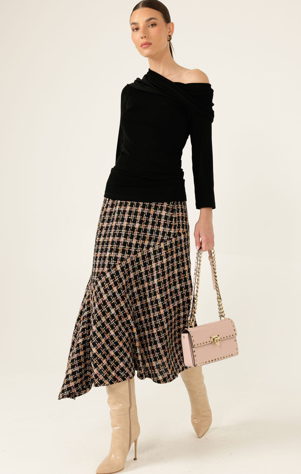 • Wear cowl-neck, off shoulder, or A-symmetric