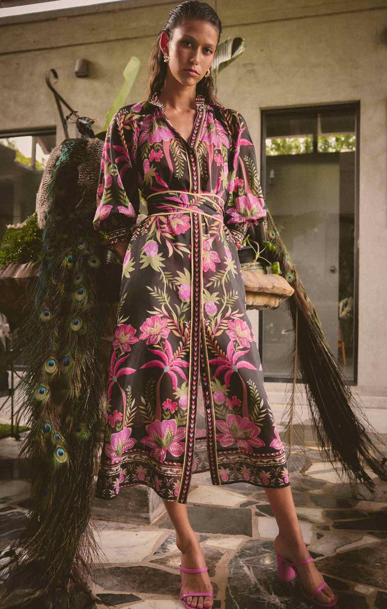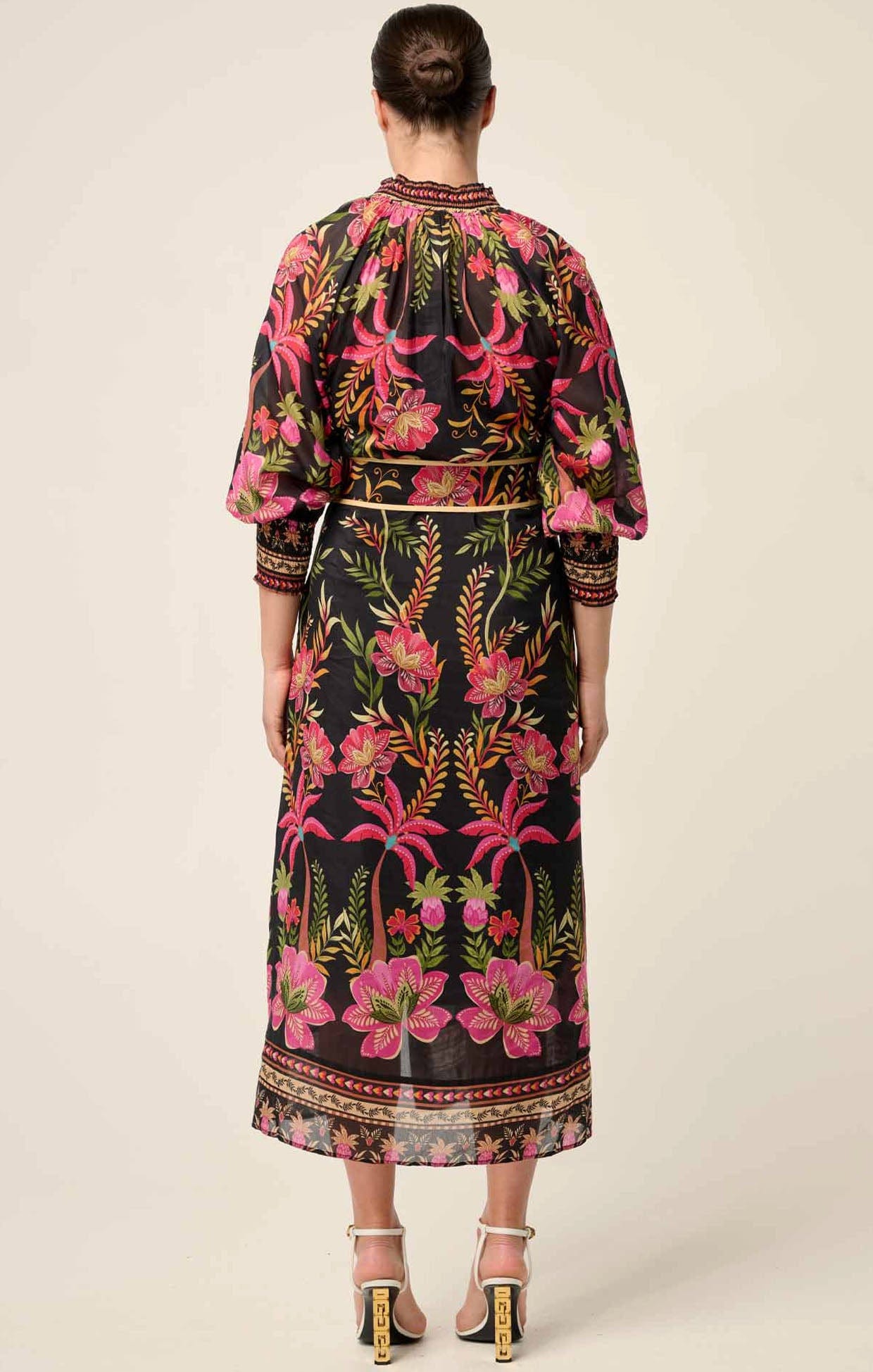 The Carmen Maxi Dress is made from a luxurious silk cotton blend, making it the perfect choice for holidays and special occasions. Its striking placement print on a charcoal base is complemented by an easy A-line silhouette, soft waist tie, and flowy blouson sleeves.