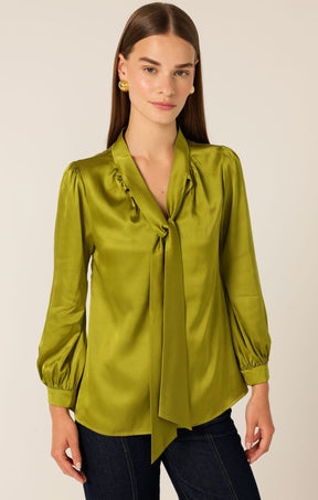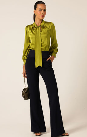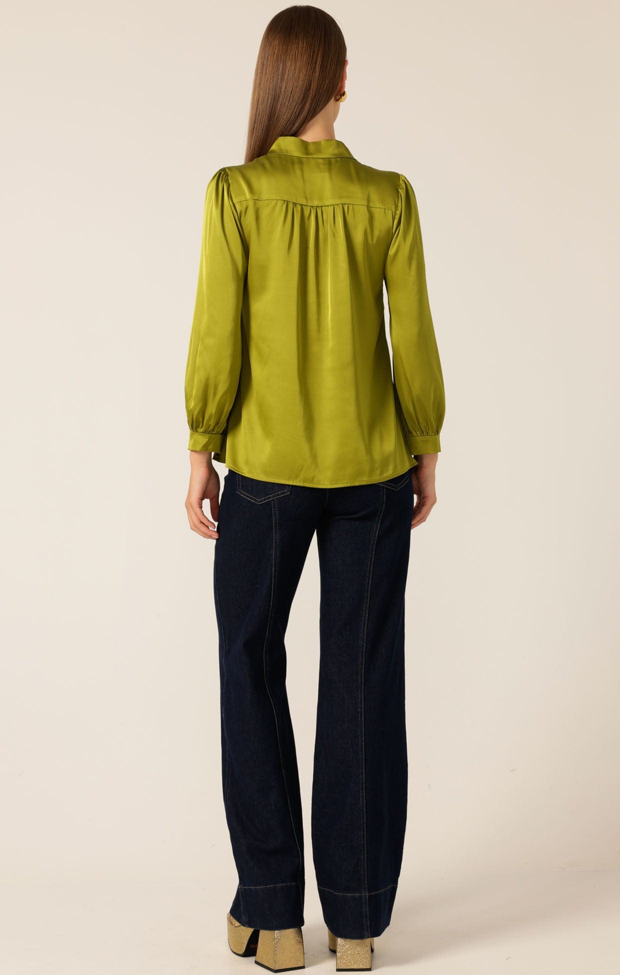 The Hatchie Blouse is timeless elegance, crafted from luxurious satin with a relaxed fit and versatile design. Featuring long bishop sleeves, a chic neck tie, and back pleat detailing for added ease, it’s perfect for work or events and can be styled tucked in or out.