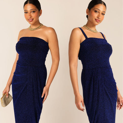 The Merle Strapless Maxi Dress is effortless elegance with a shimmering metallic stretch fabric and a flattering draped silhouette. Featuring a fold-down band detail, removable straps for bra-friendly styling, and a hidden elasticated waistband for shape, this maxi is perfect for formal events and weddings.